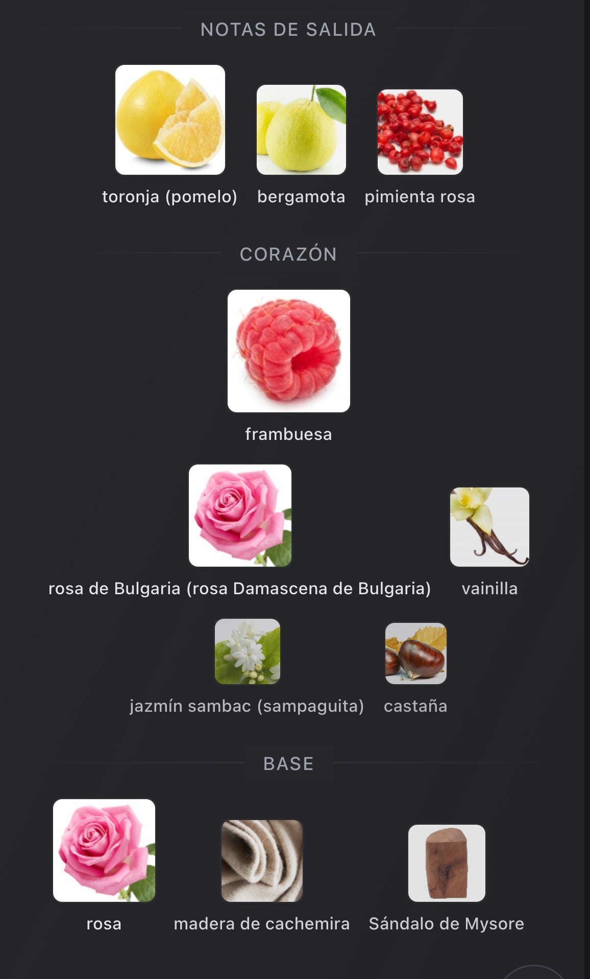 - Notas de corazón: rosa, jazmín, lirio de los valles — un corazón floral luminoso y refinado que aporta romanticismo, suavidad y una feminidad/masculinidad equilibrada y seductora.