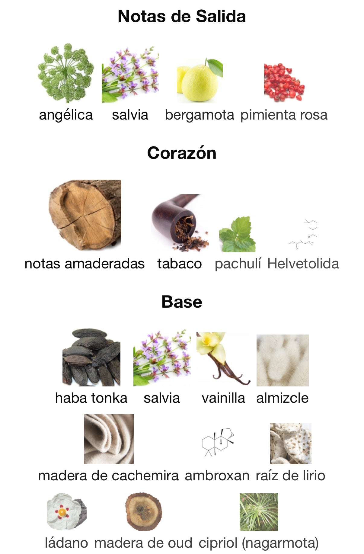 - Notas de fondo: haba tonka, salvia, vainilla, almizcle, madera de cachemira, ambroxan, raíz de lirio, ládano, madera de oud, cipriol (nagarmota) — un fondo rico y envolvente que combina dulzura, resinas y maderas nobles para una estela elegante y persistente.