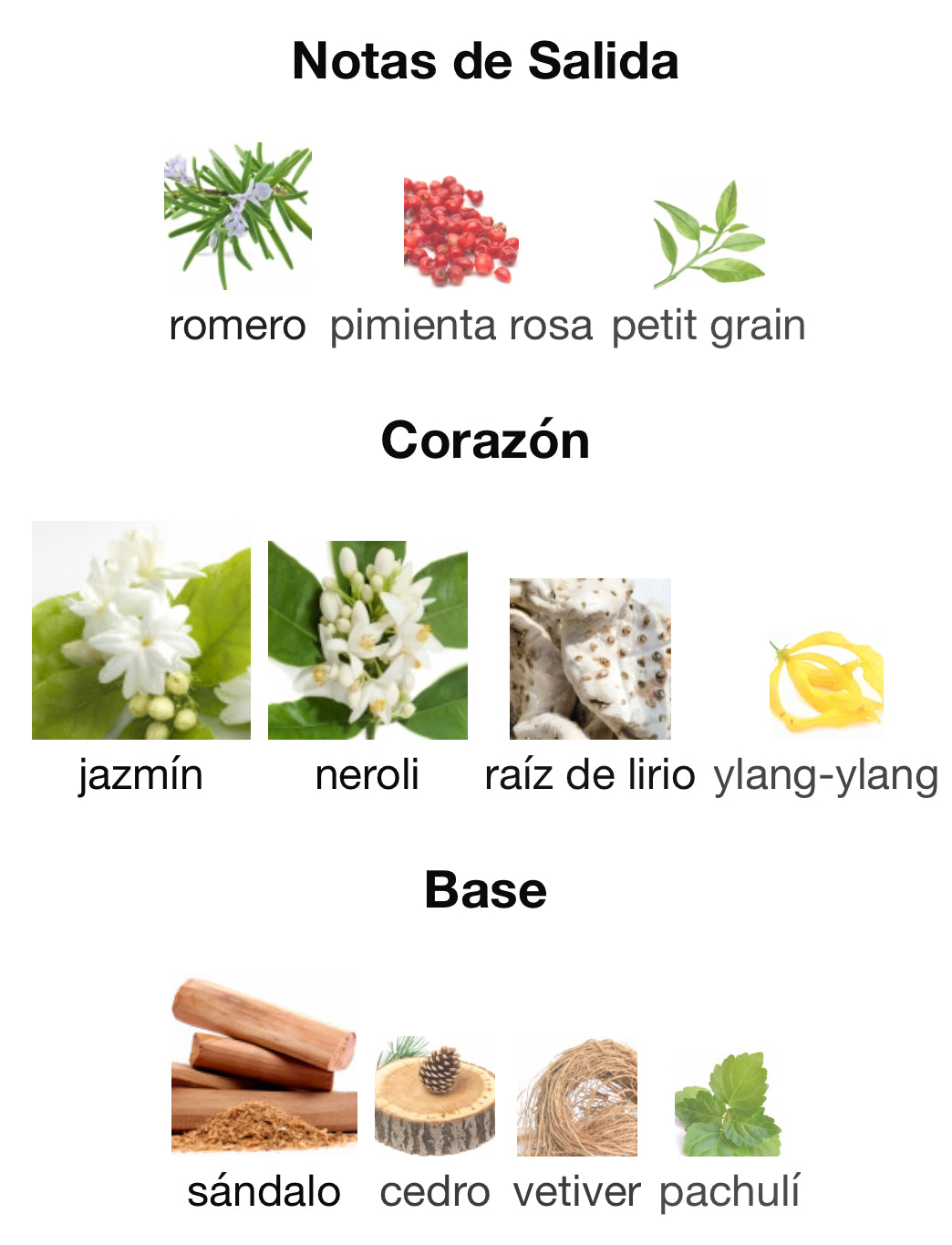 - Notas de salida: romero, pimienta rosa, petitgrain — una apertura fresca, vibrante y aromática que despierta los sentidos con modernidad.