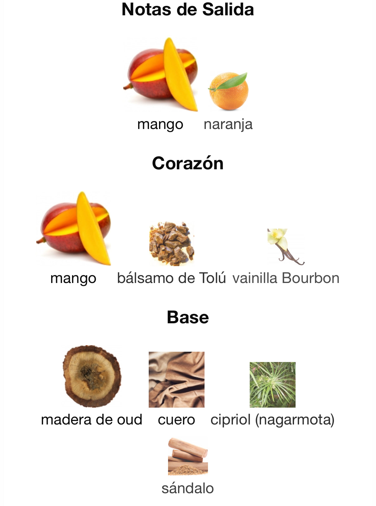 - Notas de corazón: mango, bálsamo de Tolú, vainilla Bourbon — un corazón cremoso y resinoso, dulce y cálido, que vuelve el mango más profundo y adictivo.