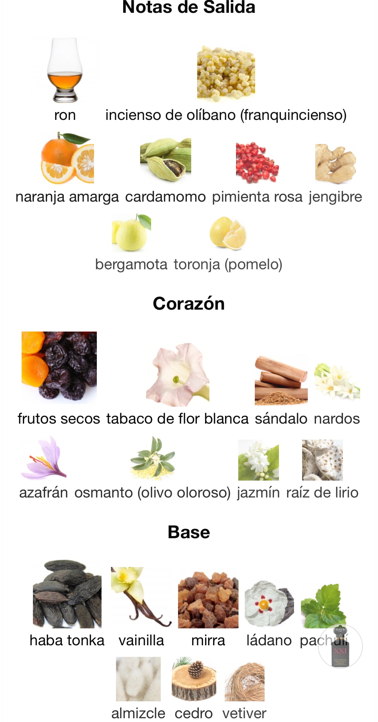 - Notas de salida: ron, incienso (olíbano), naranja amarga, cardamomo, pimienta rosa, jengibre, bergamota, toronja — una apertura intensa, especiada‑cítrica con un toque ahumado y vibrante.