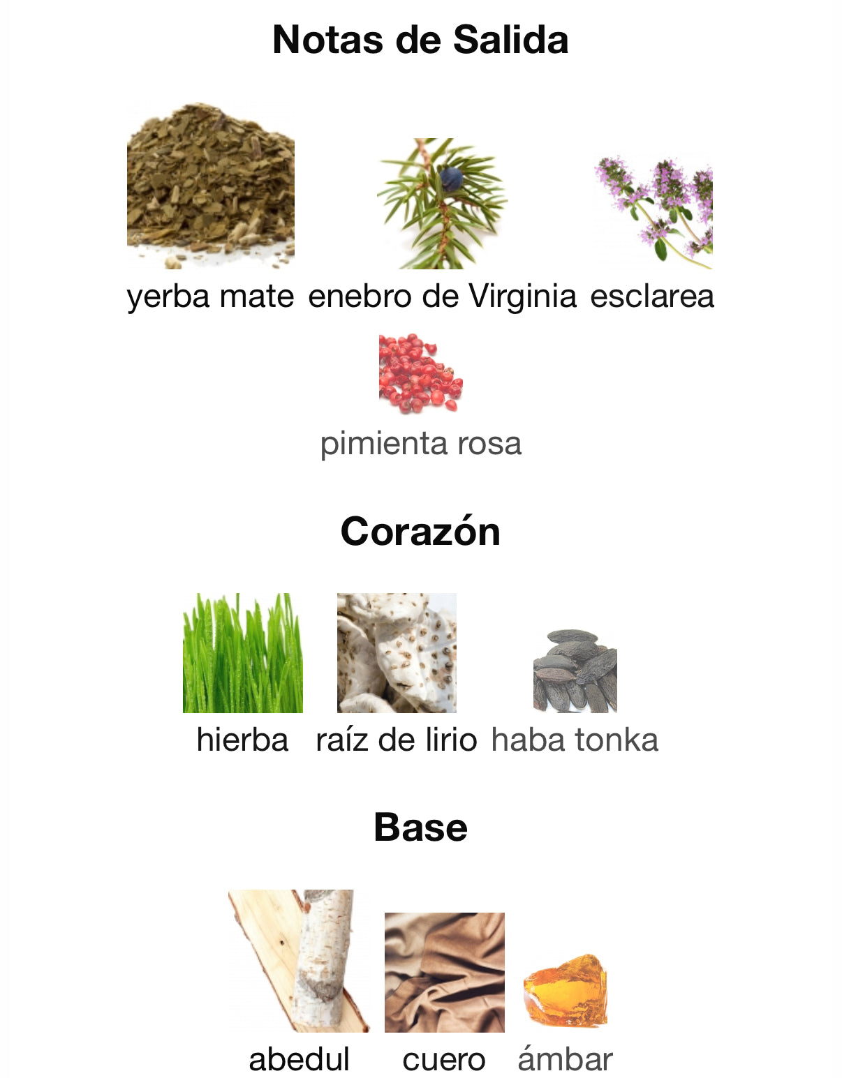 - Notas de corazón: haba tonka, hierba, iris (orris) — un corazón texturizado y sofisticado donde lo terroso se combina con matices herbales y florales suaves, aportando profundidad y carácter.