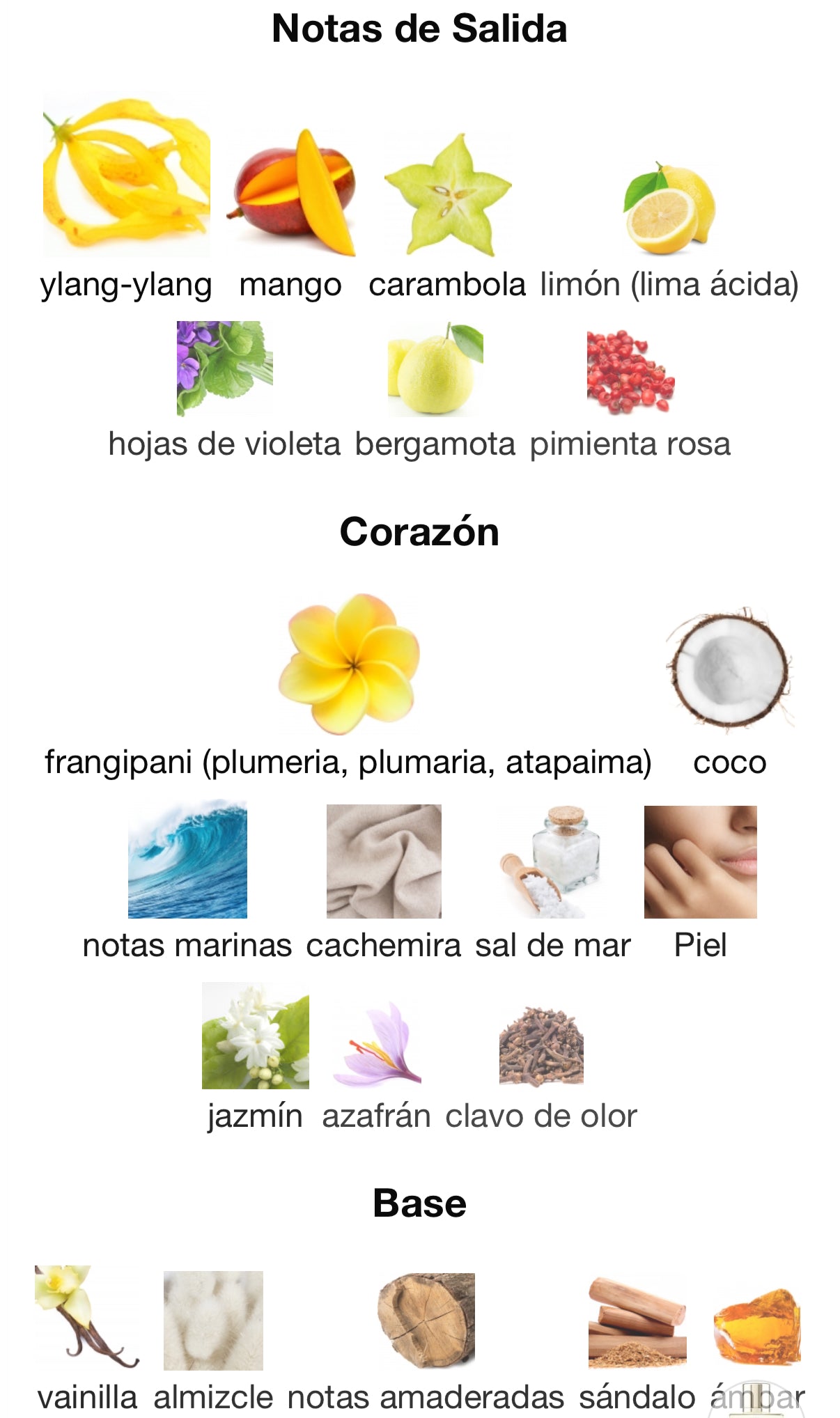 - Notas de corazón: ylang‑ylang de Madagascar, frangipani, jazmín, mar de notas salinas — un corazón floral‑acuático con profundidad tropical.