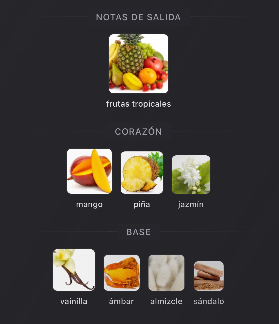 Notas de corazón: mango, piña, jazmín — un corazón afrutado y floral que combina la dulzura exótica de los frutos con la sofisticación elegante del jazmín.