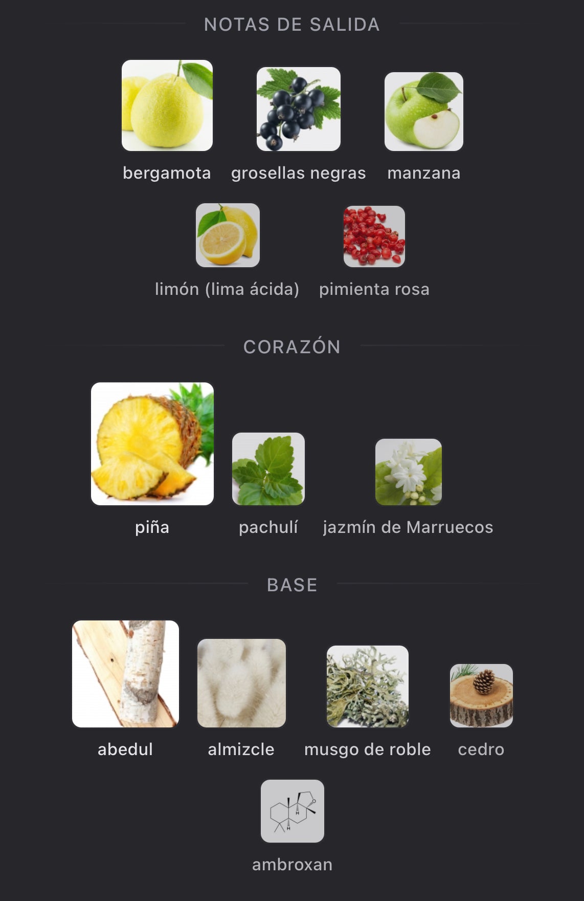 - Notas de Corazón: En el corazón, la profundidad del abedul seco y el toque ahumado del pachulí se mezclan con la sofisticación del jazmín marroquí, creando un contraste equilibrado entre frescura y carácter.