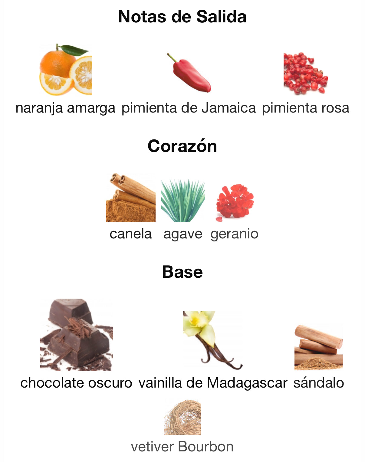 - Notas de corazón: canela, agave, geranio — un corazón cálido y sofisticado, ligeramente dulce y floral, que equilibra lo especiado con un toque moderno y seductor.