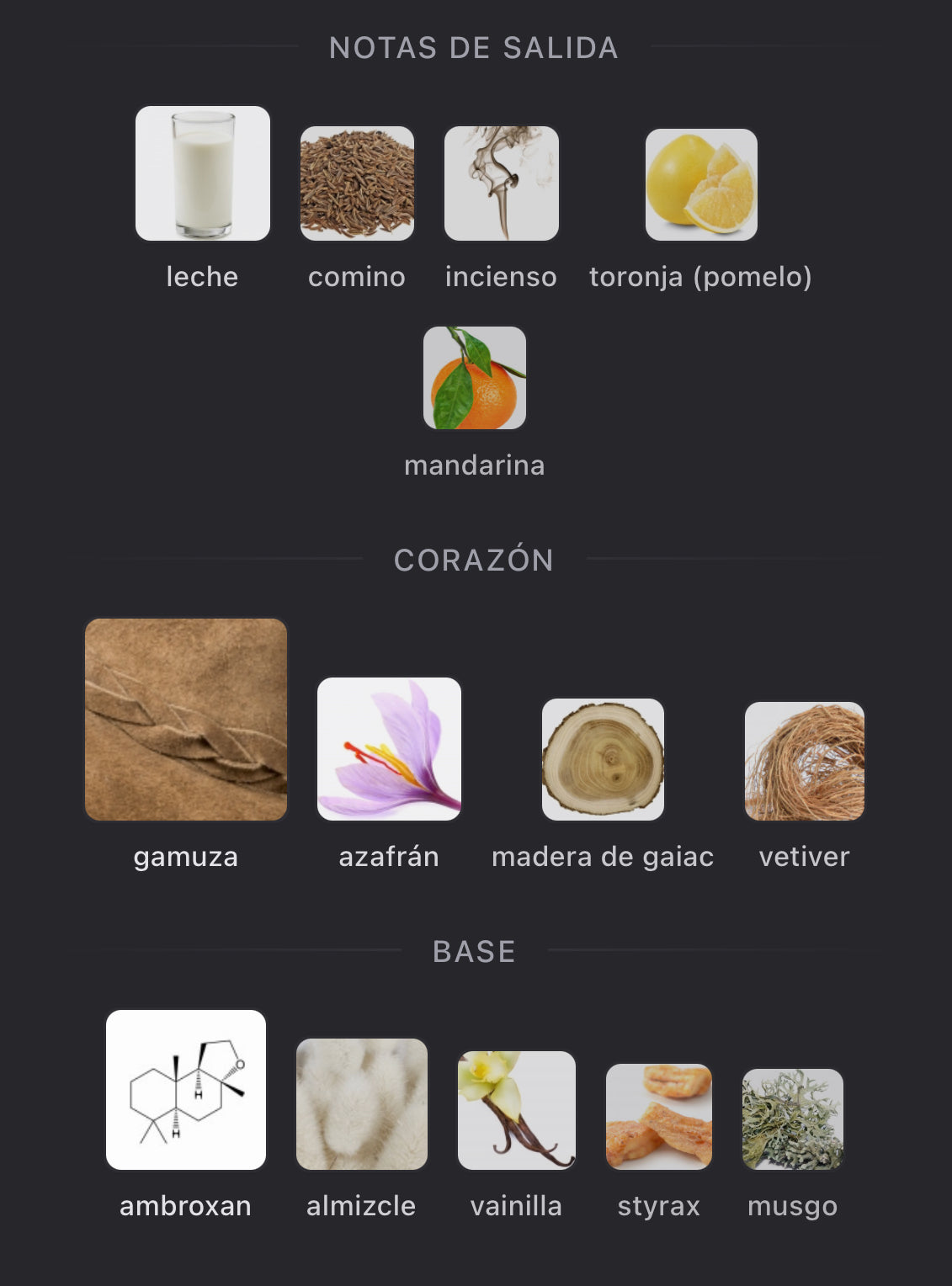 - Notas de fondo: vainilla, styrax, ambroxan, musgo, almizcle — un fondo cálido, acogedor y ligeramente dulce que deja una estela sofisticada, cremosa y memorable.