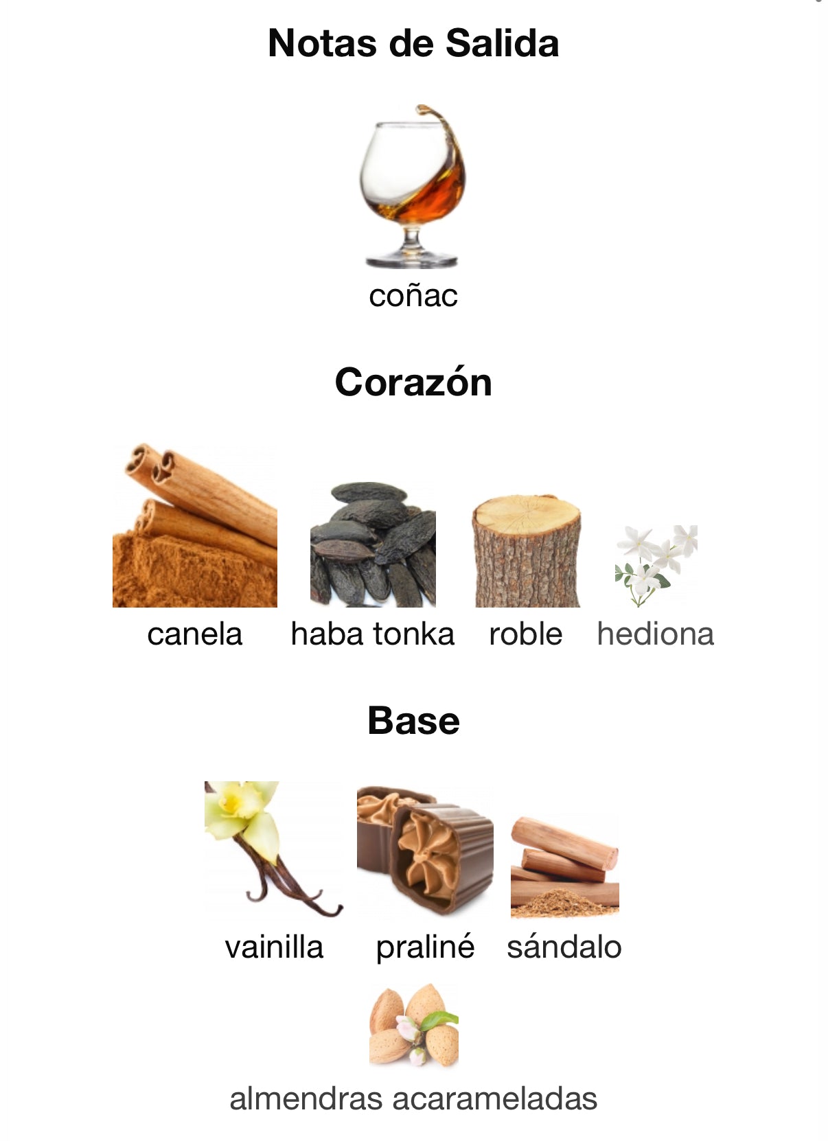 - Notas de Corazón: En el corazón, la cremosidad del praliné se entrelaza con la riqueza de la vainilla y la profundidad del roble, evocando la madera de las barricas donde reposa el mejor coñac.