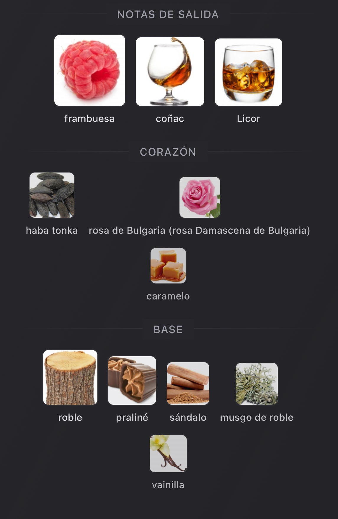 - Notas de fondo: praliné, roble, sándalo — una base cremosa, profunda y gourmand con matices amaderados y dulces, que prolonga la estela con elegancia, calidez y sofisticación.