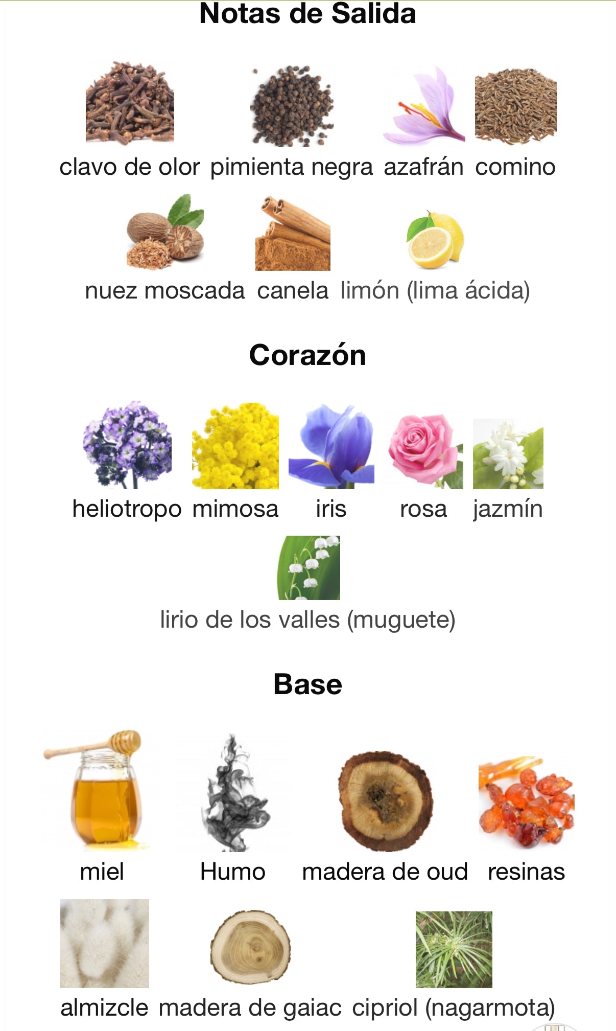 - Notas de fondo: miel, resinas, madera guaíaco, nagarmotha, oud, pachulí, vetiver, incienso‑humo — una base cálida, amaderada, con dulzura oscura y estela persistente que envuelve los sentidos.