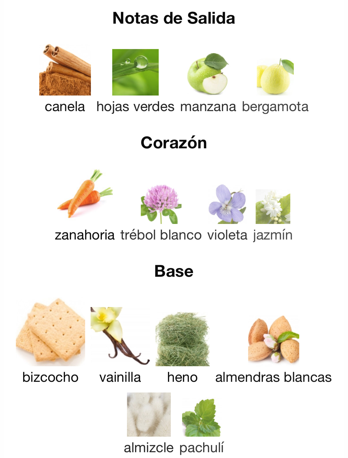 - Notas de fondo: galleta (biscuit), vainilla, heno, almendra blanca, almizcle, pachulí — una base cálida, ligeramente gourmand y con matiz terroso que perdura.