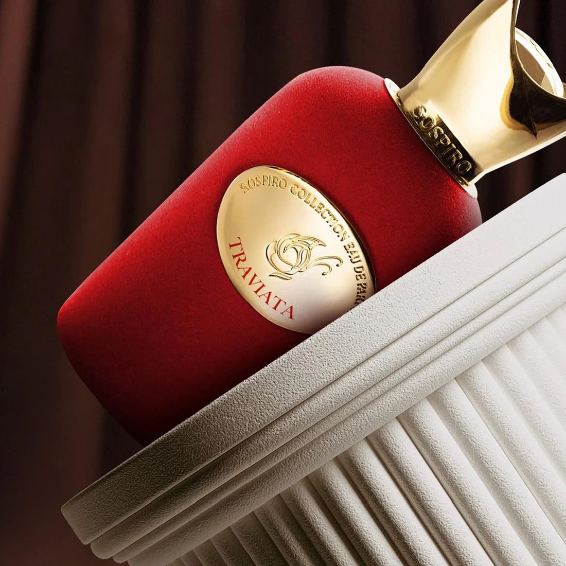 El frasco de Traviata mantiene la estética refinada de Sospiro: simple, elegante y con presencia discreta — ideal para una fragancia de corte moderno y lujoso.