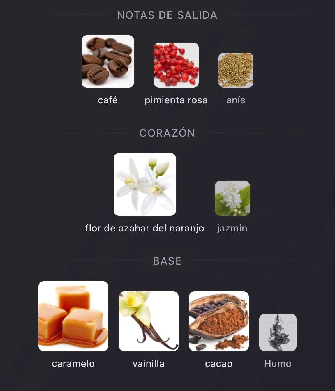 - Notas de fondo: caramelo, vainilla, cacao y humo — un secado cálido, dulce y seductor donde el caramelo y la vainilla crean una base cremosa, el cacao aporta riqueza y el humo deja un acabado oscuro y muy memorable sobre la piel.