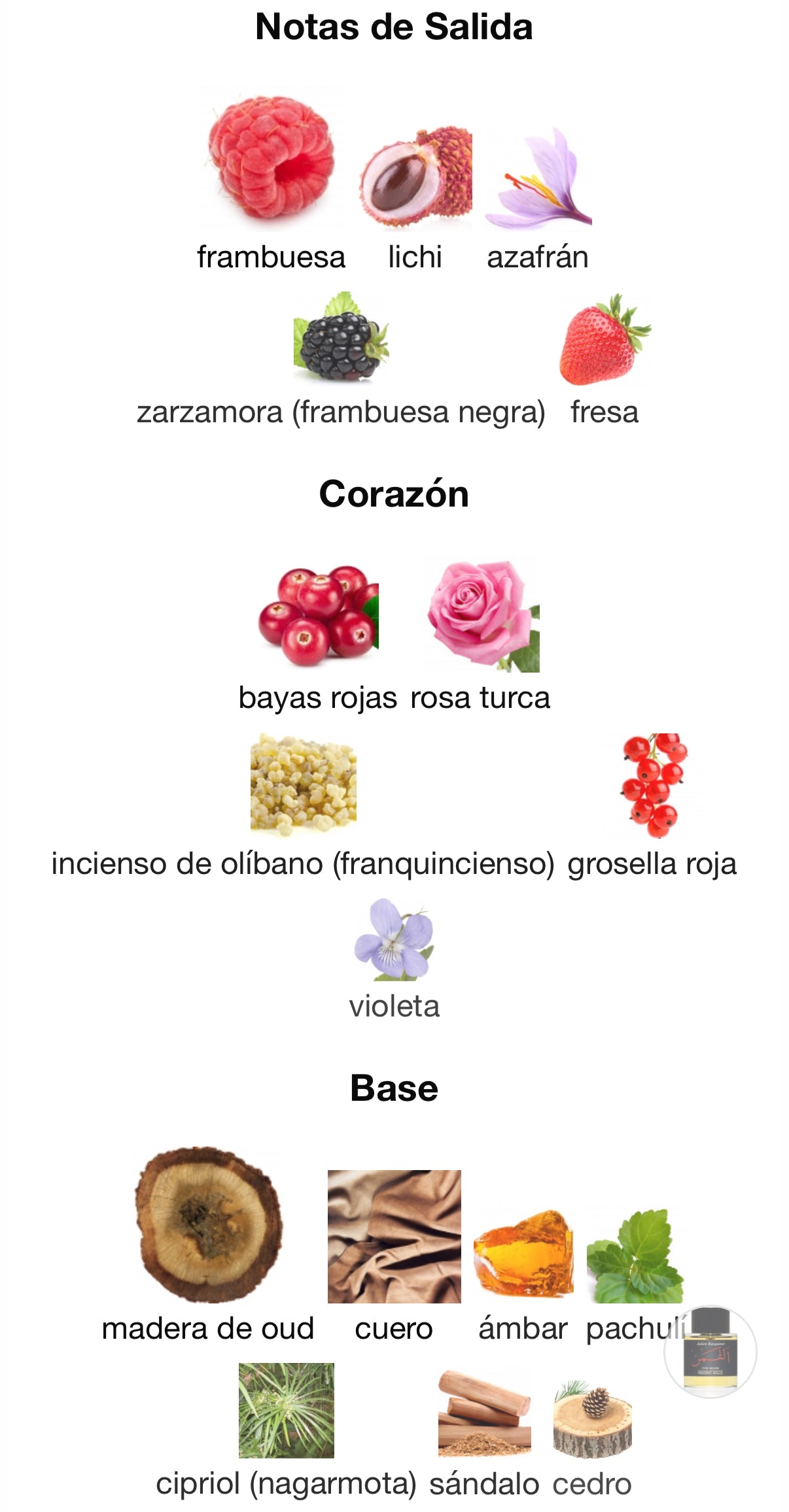 - Notas de corazón: bayas rojas, grosella roja, rosa turca, incienso de olíbano, violeta — un corazón complejo, frutal‑floral y especiado, que aporta volumen, elegancia y un toque exótico.